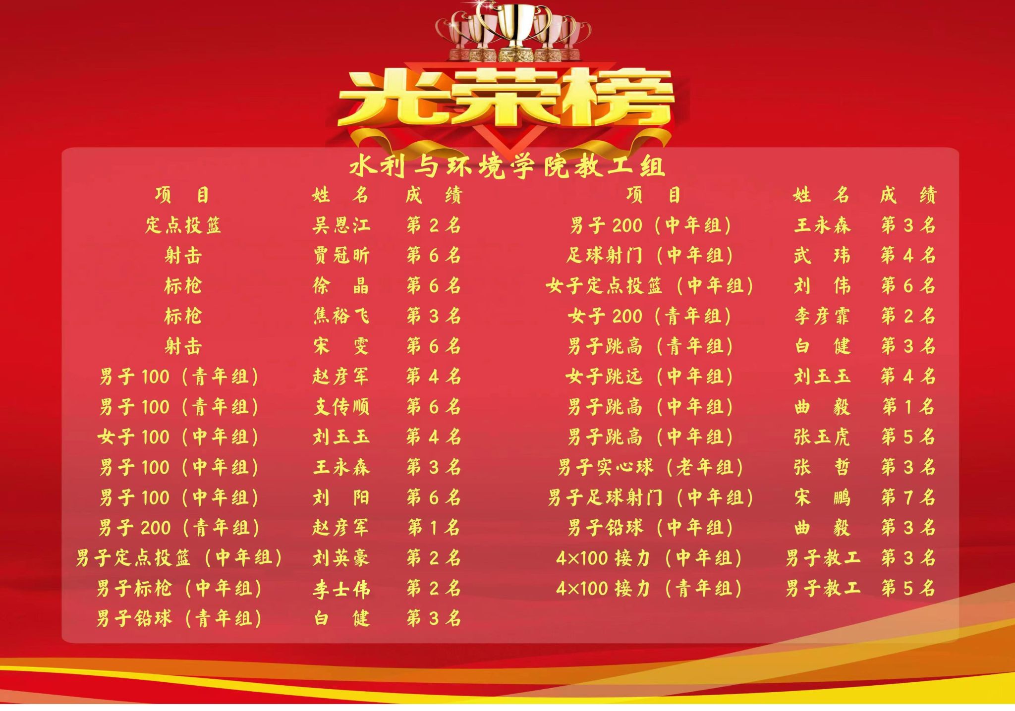 赛场上,学院的运动员们顽强拼搏、奋勇争先,在多项比赛中取得优异成绩。教工组共有66名运动员参与比赛,在100米、200米、4×100接力、标枪、定点投篮、跳高、实心球、铅球等比赛项目中斩获前三甲14项,其中赵彦军荣获男子青年组200米第一名,曲毅荣获男子跳高中年组第一名,累计获得奖项27项,团体总分位列教工大基层工会第二名。学生组共有44名运动员参赛,在1500米、3000米、铅球、标枪、铁饼等项目斩获前三甲8项,其中朱朗荣获男子1500米第一名,诺明达拉荣获标枪、铁饼第一名。
