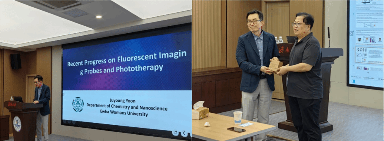 黄加栋代表学校对Yoon教授的到来表示热烈欢迎和衷心感谢,简要介绍了我校相关研究领域的发展情况以及Yoon教授的学术经历和成就,希望Yoon教授借此机会对学校的相关研究和课题组多进行指导,并就共同申报科技项目、研究生联合培养等工作与Yoon教授进行了深入交流。Yoon教授的报告题目为“Recent progress on fluorescent imaging probes and phototherapy”,他详细介绍了荧光探针、光动力治疗和光热治疗方面的重要进展,分享了他们在新型荧光成像探针、智能光疗纳米材料领域的创新成果。报告内容条分缕析,高屋建瓴,为该领域的研究带来了新的思路和方向。