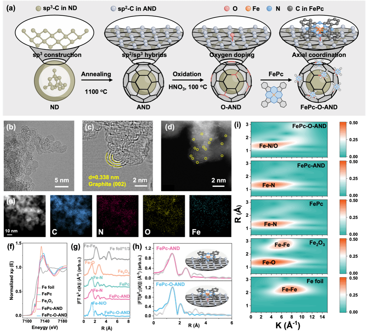 针对这一挑战,该研究提出轴向氧配位调控单原子Fe催化剂自旋态的创新策略,成功制备了铁酞菁-氧修饰退火纳米金刚石单原子催化剂(FePc-O-AND)。研究首次发现,轴向氧配位可诱导Fe中心从高自旋态转变为中自旋态,形成未占据的Fe 3dz2轨道,实现对PAA的羟基氧定向配位与内球络合活化,构建了非自由基电子转移催化路径。该催化剂展现出卓越的催化性能,对典型酚类污染物4-氯酚的降解速率常数高达2.11 min−1,较传统单原子催化剂提升近3倍,且能选择性将其转化为高分子量聚合类产物(n≥5),实现污染物从“降解去毒”到“高值转化”的低碳治理新模式。