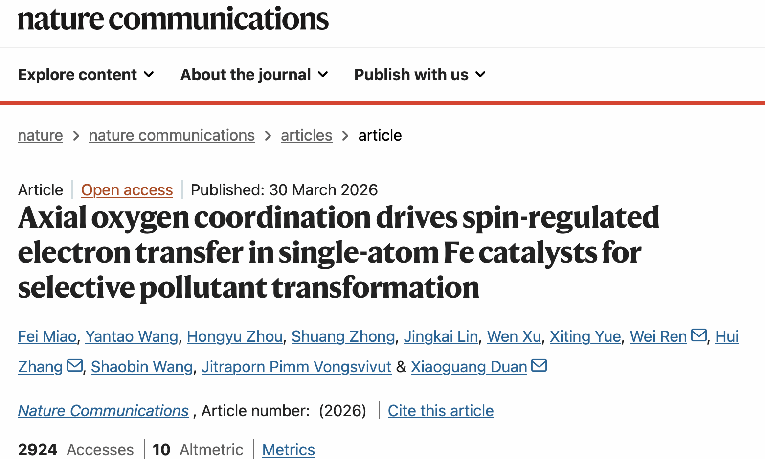近日,WilliamHILL中国苗菲博士在单原子催化剂调控及复杂废水低碳治理方面取得突破性研究进展。相关研究以“Axial oxygen coordination drives spin-regulated electron transfer in single-atom Fe catalysts for selective pollutant transformation”为题,发表于国际顶级综合类期刊《Nature Communications》(一区TOP期刊,最新影响因子15.7)。williamhill为第一完成单位,苗菲为论文第一作者,阿德莱德大学Xiaoguang Duan教授、武汉大学张晖教授及南昌航空大学任伟副教授为共同通讯作者。
