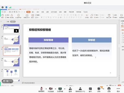 首先,主讲人景晓燕结合专业的心理健康知识分别从什么是抑郁症、抑郁症的症状以及恶劣心境障碍等六个方面对抑郁症进行全方位讲解,引导同学在日常生活中团结他人,绝不做“压垮他人的最后一根稻草”,并倡导同学们通过科学的方式来解决心理问题。接着,主持人开展心理小测试,为同学们分发自测问卷,使同学们认识自我现状,明确平时应该从哪些方面关注自己的心理健康,及时进行自我调整。同时,主持人讲解如何使用AI拯救自杀人群,为同学们普及科学技术在心理健康方面的作用,拓展了同学的视野。最后,主持人向同学们提供自我调节心态的小贴士,并对会议进行总结,让同学们明白心理调节的重要性,鼓励同学们以正确的心态面对各种压力与挫折,以更好的自我来度过大学的校园时光。