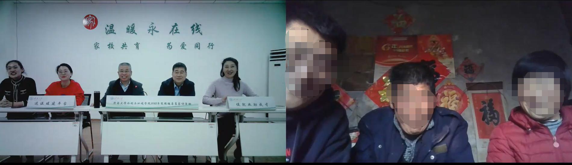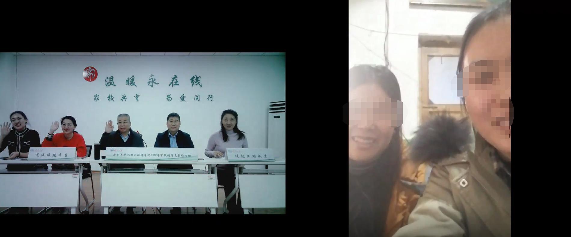 考虑到疫情的特殊情况,学院采用视频连线的方式向两位大四同学彭同学、赵同学送上新年祝福。学院领导老师首先连线了彭同学,这是自2018年以来第3次对彭同学进行家访。辅导员刘孟頔老师向彭同学的家人介绍了彭同学的在校情况,彭同学在校期间成绩优异、勤奋刻苦,连年荣获校一等奖学金,生活上积极乐观,与同学们相处融洽。徐征和院长与学生家长交流了当前的家庭情况,询问今年收成如何,并对彭同学的考研情况进行悉心询问和指导。王义书记鼓励彭同学继续保持勤奋刻苦的学习态度,积极向上,不辜负学校和家长的期望,并祝福彭同学考入理想院校,继续提升自己。
