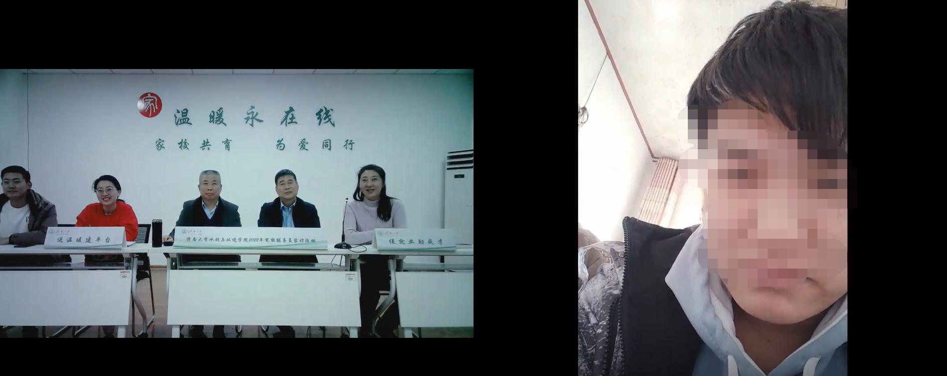 由于疫情原因,本次家访采取线上视频连线的方式。学院领导老师视频连线了宋同学、马同学,2021级辅导员张通老师向宋同学和马同学的家长介绍了学生的学习情况和在表现,以及学校、学院对学生的资助、帮扶情况。徐征和院长悉心询问了两位大一新生对大学生活的适应情况和期末考试情况,鼓励两名同学充分利用寒假时间充电学习,加强对学科专业的认识,进一步提升专业素养。王义书记在与家长的沟通中进一步了解了学生的家庭状况、成长环境,对家长关心的问题进行了解答,并积极征求家长对学院工作的意见建议。张良红副书记勉励学生自强自立,积极进取,并为两位同学及家人送上了新年的祝福。