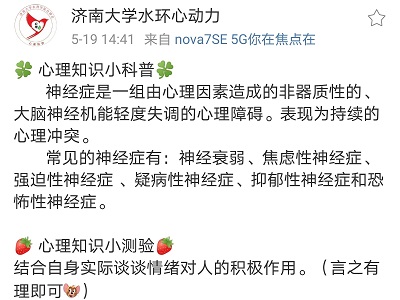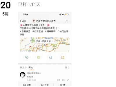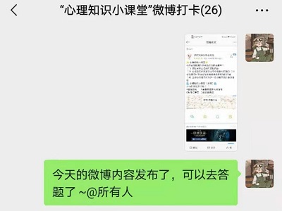 本次活动通过微博“williamhill水环心动力”和微信小圈子打卡展开,由自律会心健部工作人员每天挑选心理知识及心理问题发布在微博“williamhill水环心动力”中,参与人员需在活动期间关注微博“williamhill水环心动力”,坚持每天认真学习微博发布的心理知识,根据自己对问题的理解和心理知识的掌握情况在评论区进行做答,并将自己答题的截图发布在微信小圈子“‘心理知识小课堂’打卡圈”进行打卡。新颖的线上活动形式大大激发了同学们的积极性,同学们踊跃参加答题,董庆春、董怡彤、李倩、倪圆圆、吴向楠、尚凯月等十一位同学坚持每天答题打卡达十天及以上,其中董庆春同学的正确率最高。