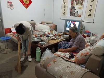 团队成员程穆恩在社区了解到高奶奶孤身一人生活,于是前往高奶奶住所探望。程穆恩帮助高奶奶平常忽略的角落灰尘清理出来,又将家里的玻璃窗擦拭一新。在她忙碌的过程中,高奶奶拿出收音机给程穆恩播放音乐,给她讲了一些自己年轻时的故事。通过此次实践活动,程穆恩从老人身上感受到了对生活的乐观与热爱,并从老人的身上学到了许多的人生哲理,认识到了敬老爱老的意义与重要性。