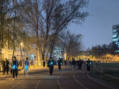活动前期,学生会负责人通过线上的方式在全校范围内开展宣传,提升活动影响力,带动全校同学积极投身于活动之中,为活动顺利进行起到了积极作用。3月25日晚间七点,夜幕悄然降临,同学们在北苑操场进行赛前签到并领取荧光棒,整个活动现场荧光点点,随后同学们佩戴荧光棒进行一次八百米慢跑,完成跑步后领取精美的活动奖品——定制荧光手环。虽然夜色已深,但参与者的热情丝毫未减,他们表示:“此次荧光夜跑活动具有很强的趣味性,能很好地缓解现代社会的快节奏和日常学习生活带来的精神心理压力。”他们通过点亮荧光手环的方式让夜晚更加光亮,彰显出我校学生活力四射、朝气蓬勃的精神面貌。