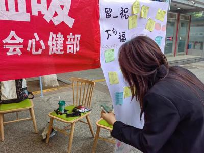 活动包括领取好运便签和留下祝福便签两部分,得到了同学们的广泛关注与积极参与。活动开始前一周,部门以推文及二维码形式在网络上收集了大量同学们的祝福,作为等待领取的好运便签。活动开始后,邀请路过同学参与活动。参与的同学首先到左侧海报上随机抽取一张好运便签,然后在右侧海报上留下一份祝福的新便签,随着活动的进行,被吸引过来参与活动的同学不断增多,同学们都收获到了来自他人的真挚祝福。活动结束时,左侧海报上提前准备好的好运便签被全部带走,而右侧海报上则贴满了同学们留下的祝福。