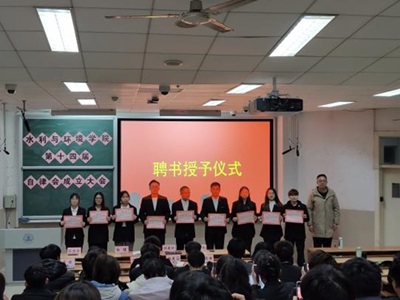 紧接着干事代表许艺宝上台发言,他朝气蓬勃的神态与铿锵有力的言语充分展现了新生干事对学生工作的热情与信心以及对学院美好未来的期盼。大会进行到第四项,部长团和主席团的代表依次上台讲话。两位代表回顾了过去一年的工作,反思不足,总结经验,对自律会后续的工作与活动做了详细规划与展望。大会最后进行了第十四届自律会主席团与部长团聘书颁发仪式,自律会全体成员于台前合影留念,大会到此圆满结束。