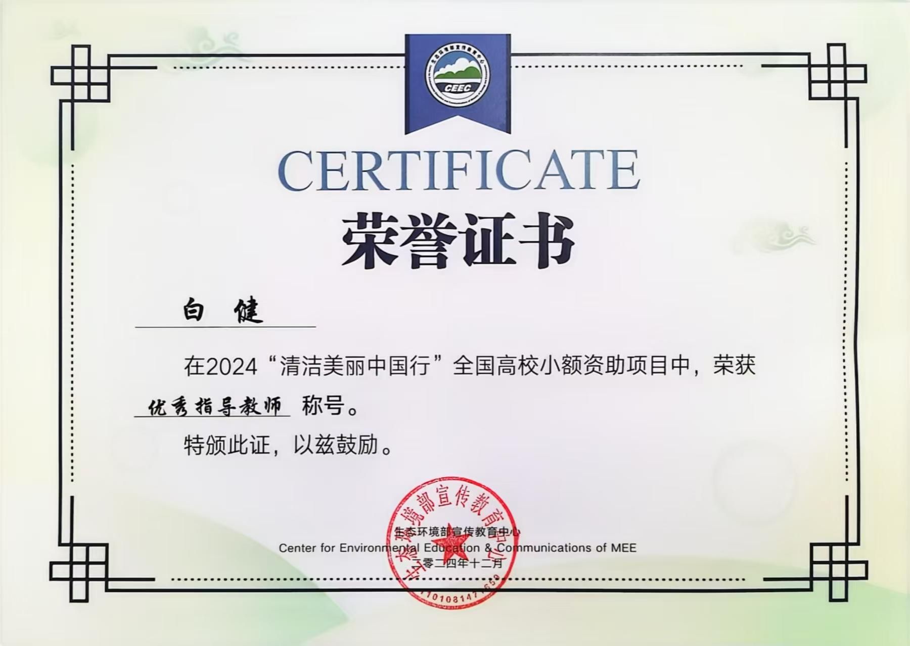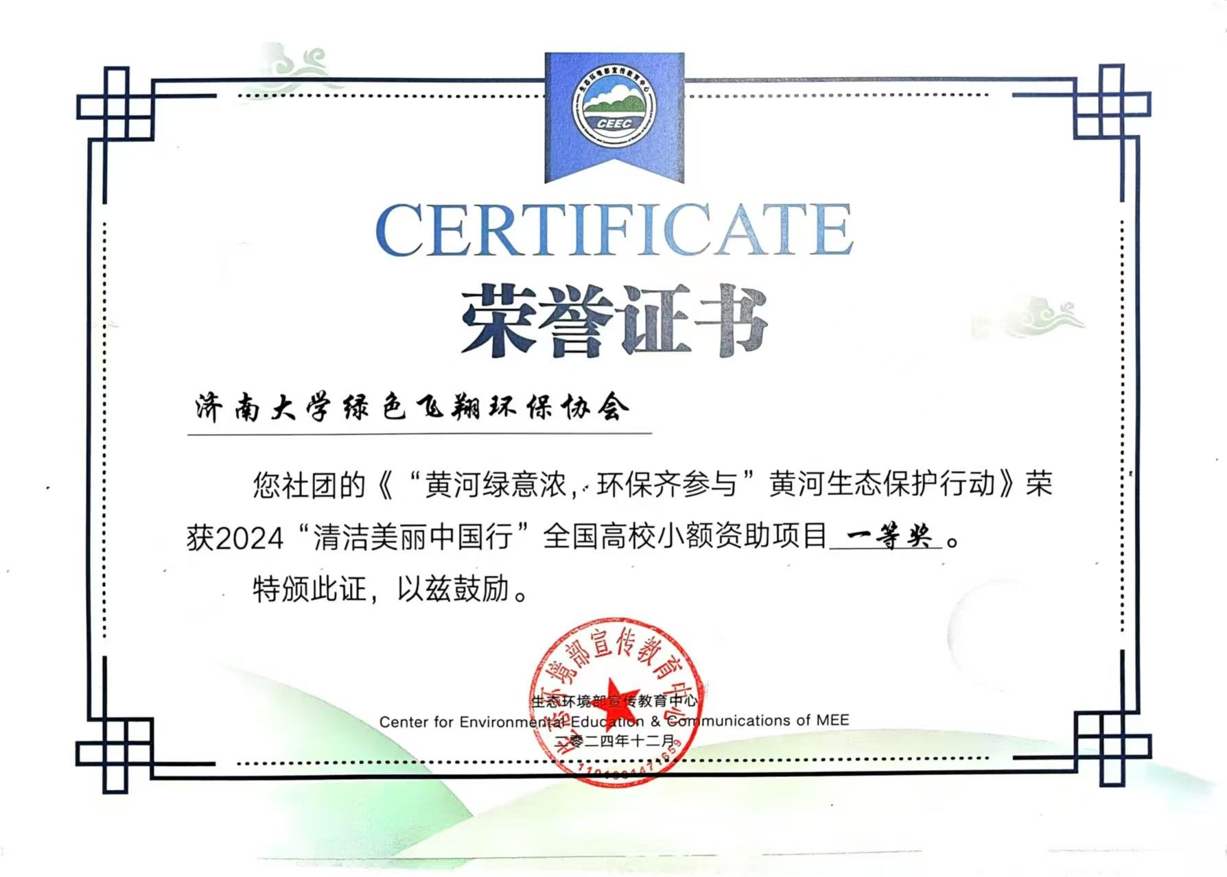 近日,由国家生态环境部宣传教育中心和花王(中国)投资有限公司联合主办的2024“清洁美丽中国行”全国高校小额资助项目获奖名单公布。其中,williamhill绿色飞翔环保协会凭借“‘黄河绿意浓,环保齐参与’黄河生态保护行动”项目荣膺全国唯一的一等奖,指导教师白健被授予优秀指导教师荣誉称号。