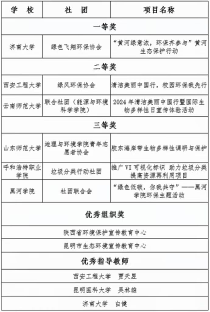 据悉,2024“清洁美丽中国行”全国高校小额资助项目由生态环境部宣传教育中心和花王(中国)投资有限公司共同主办,旨在全面落实生态环境部、中央社会工作部等九部门联合印发的《关于深入开展“美丽中国,我是行动者”系列活动工作方案》,推动构建生态环境治理全民行动体系,为锚定美丽中国建设目标汇聚力量。项目自7月启动以来,备受广大高校学子的关注和支持,共有来自全国26个省(市、自治区)102所高校的155个社团提交了项目方案。经专家初评,其中20个社团入围线下实施阶段。经专家终审,评出一等奖一名、二等奖两名,三等奖三名以及两家优秀组织单位和三名优秀指导教师。