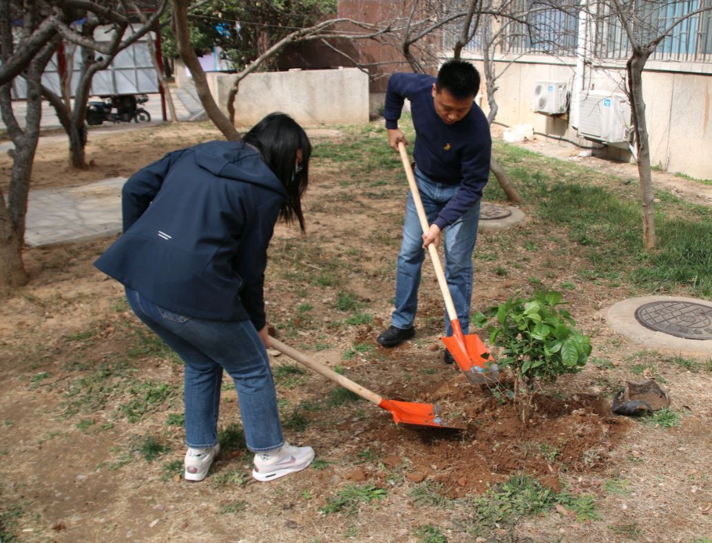 同时,学生会团支部还积极参与了树苗种植活动。校内种植桂花树和梨树共计30余棵。在志愿者们的帮助指引下,严格按照规范步骤,完成了填土、扶苗、浇水等环节,确保树苗顺利栽种。
