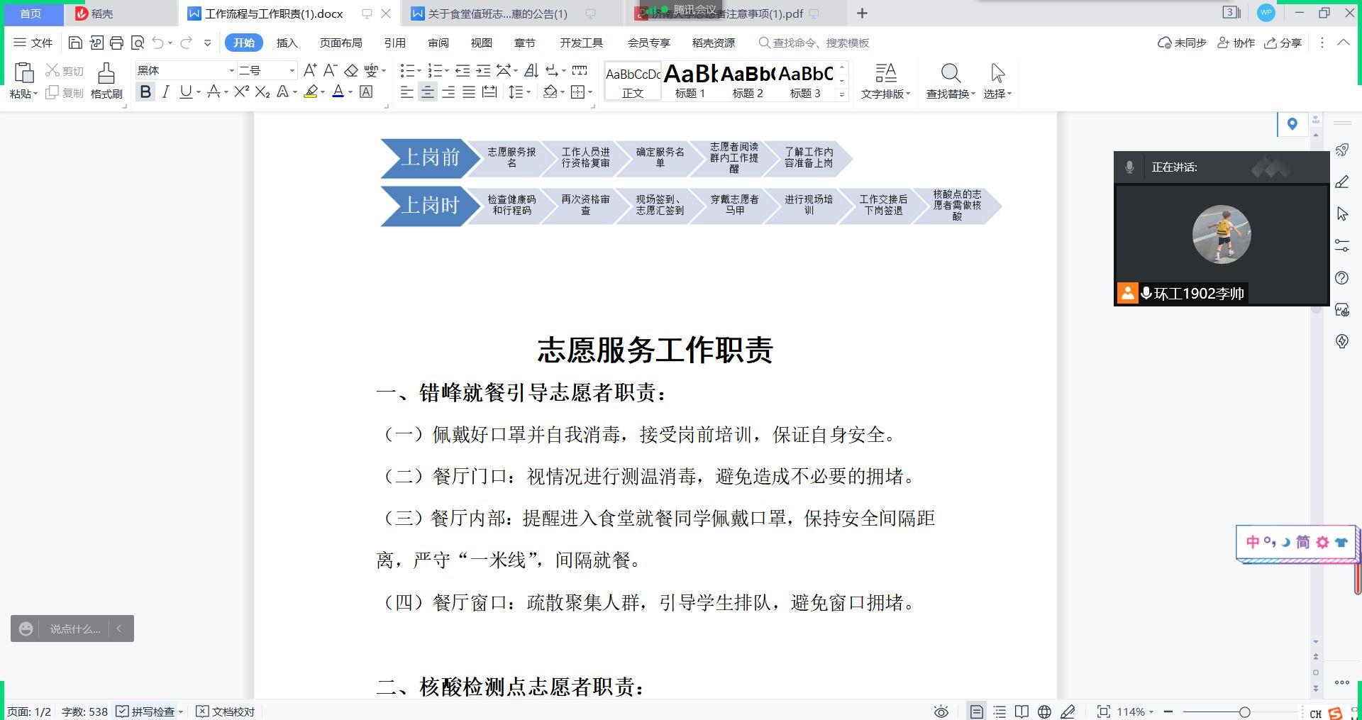 此次会议的培训内容主要分为三部分。首先,简要说明了志愿服务前物资领取方式以及签到等相关准备工作细节;然后,着重强调了错峰就餐志愿服务的工作职责:佩戴好口罩并做好自我消毒,接受岗前培训,保证自身安全;餐厅门口,视情况进行测温消毒,避免造成不必要的拥堵;餐厅内部,提醒进入食堂就餐同学佩戴口罩,保持安全间隔距离,严守“一米线”,间隔就餐;餐厅窗口,疏散聚集人群,引导学生排队,避免窗口拥堵。最后,提醒相关志愿者在志愿服务过程中应注意个人举止,听从负责老师及学生负责人的安排,以积极的态度投入到志愿服务的工作中来。