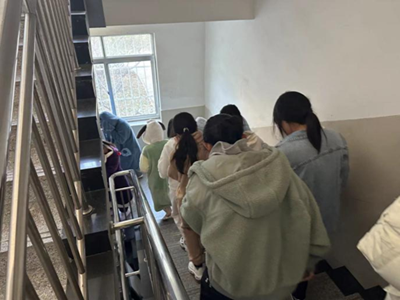 学院通过警笛与烟雾弹造势,模拟真实火情,整个场面充满了紧张的氛围,但学生们十分镇定,纷纷拿出湿毛巾,捂住口鼻,弯腰低姿,迅速且有序排成两列,按照演练要求既定路线有序疏散到指定地点。