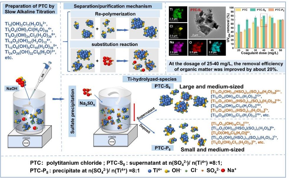 在水处理领域,钛基絮凝剂因其优异的混凝效果和强大的污染物去除能力,成为近年来研究的热点。然而,钛基絮凝剂中优势絮凝物种的分离与纯化,依旧是制约其广泛应用的瓶颈之一。为了解决这一难题,本研究提出了一种创新的硫酸盐沉淀法,对慢速滴碱法制备了富含优势絮凝物种的聚合氯化钛(PTC)投加不同[SO₄²⁻]/[Ti⁴⁺]摩尔比的硫酸钠,在[SO₄²⁻]/[Ti⁴⁺]摩尔比为8:1时,通过取代反应与重聚反应成功分离了富含大中型氯基与硫酸根基钛水解物种的优势絮凝物种PTC-S8,显著提升了其水处理效果。通过电喷雾电离飞行时间质谱(ESI-TOF-MS)、Ti-Ferron和ICP-MS等技术,印证了上述观点。研究发现,硫酸盐在这一过程中发挥了关键作用,既促进了氯基钛水解物种的重聚,也可能通过置换反应形成硫酸根基的钛水解产物。这一过程为后续的絮凝剂性能提升奠定了基础。
