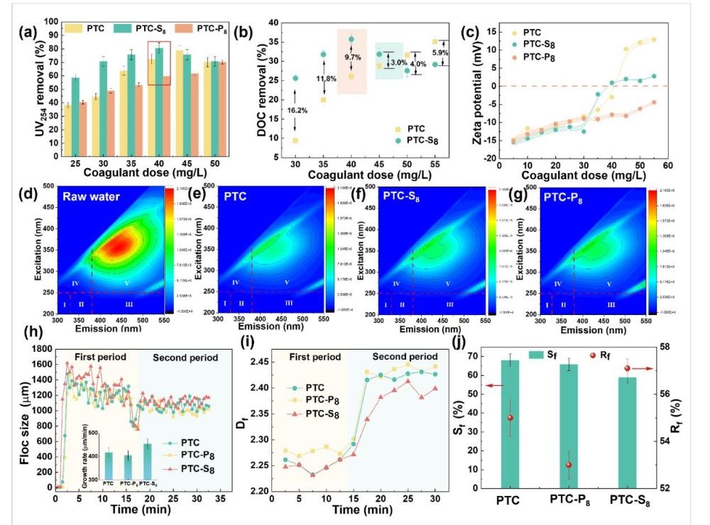 通过硫酸盐沉淀法分离出来的PTC-S8,表现出了优异的混凝性能。在黄河水济南段的混凝实验中,PTC-S8的有机物去除效率比传统PTC高出约20%。尤其是在低投加剂量下(5–30 mg/L),PTC-S8显著提高了UV254的去除率。该效果的提升主要是因为分离出的钛水解物种的较大聚合度,增强了其电中和能力,能更有效去除水中的有机污染物。此外,PTC-S8所产生的絮体较大,且具有较低的分形维数,表明絮体结构松散,缩短了沉降时间,进一步提升了水处理效率。经过剪切力处理后,PTC-S8处理的絮体还展现出更高的恢复能力。