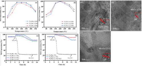 该研究构建了Cr掺杂的Ni1Mn1Crx-LDO催化剂体系,通过精准调控金属比例,Ni1Mn1Cr2-LDO展现出优异性能:在150-300℃宽温域内实现90%以上NO转化率,在SO2和H2O干扰下分别保持80%和90%以上的稳定性。这得益于Cr掺杂引发的"三位一体"协同效应—通过降低结晶度提升锰氧化物分散性、优化表面电子态增加活性位点(Mn4+/Ni3+/Cr3+浓度提升)、增强酸性位点与氧化还原能力。