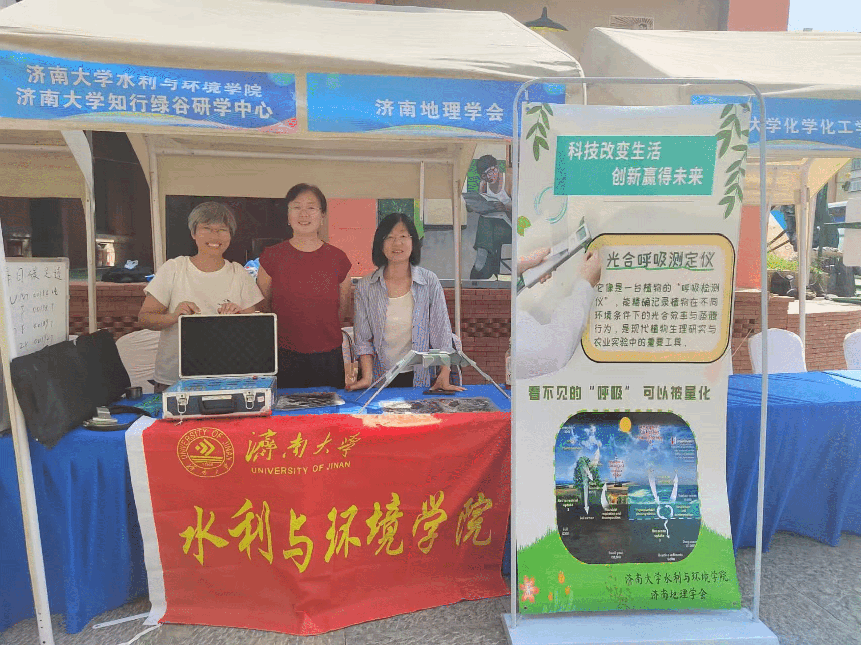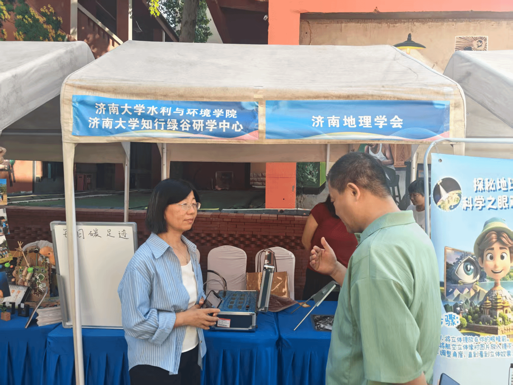 学院罗芳、刘展宏、董芳三位教师带队参展,带来一系列兼具专业性与互动性的科普内容。现场展出的桥式反光立体镜、光合速率测量仪等专业设备,让市民群众近距离接触地理观测与植物生理研究工具,直观感受科技在地理与生态领域的实际应用。通过知行绿谷研学中心介绍、生态足迹宣传海报展示,以及现场小程序计算个人每日碳足迹等互动方式,生动阐释低碳生活的意义与实现路径,引导公众从日常生活小事做起践行环保理念,进一步激发大众对科技探索与地理学科的浓厚兴趣。